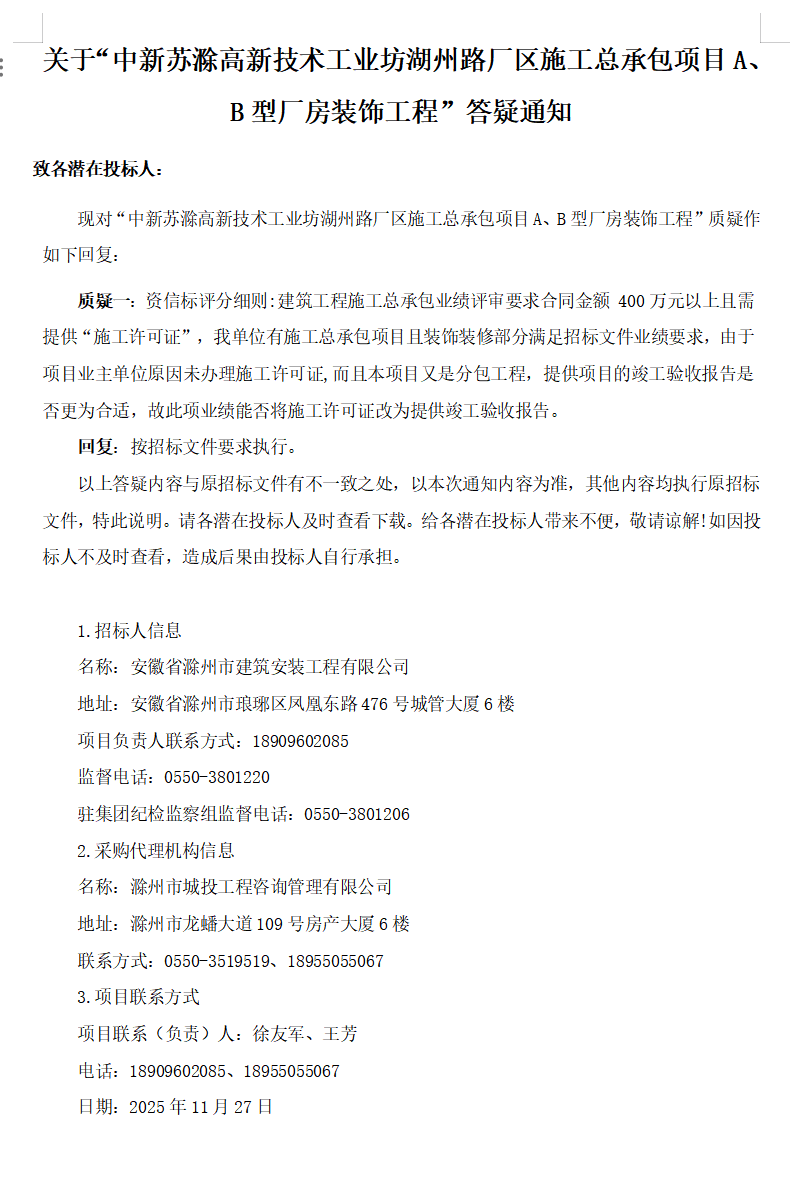 关于“中新苏滁高新技术工业坊湖州路厂区施工总承包项目A、B型厂房装饰工程”答疑通知
