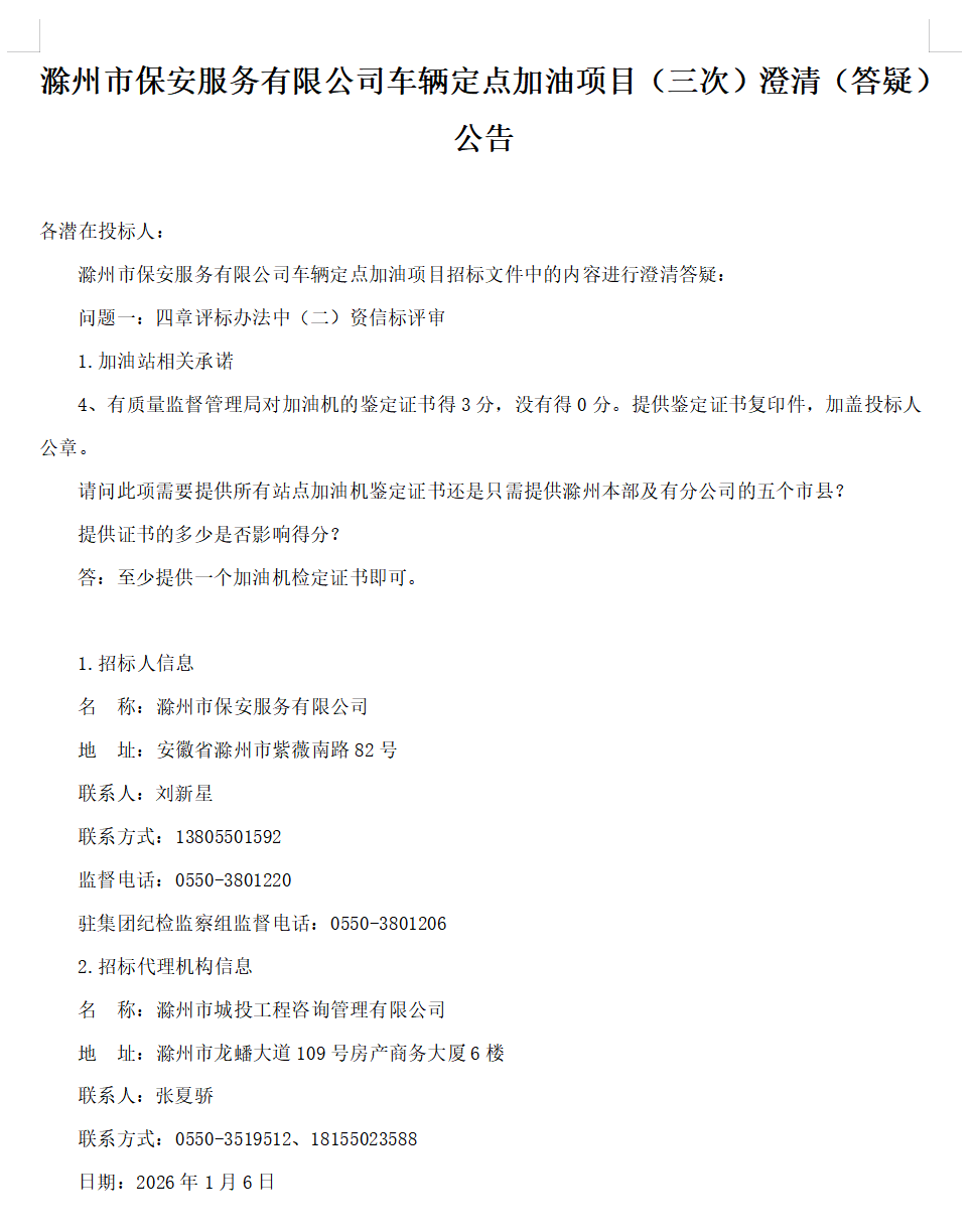 滁州市保安服务有限公司车辆定点加油项目(三次)澄清(答疑)公告