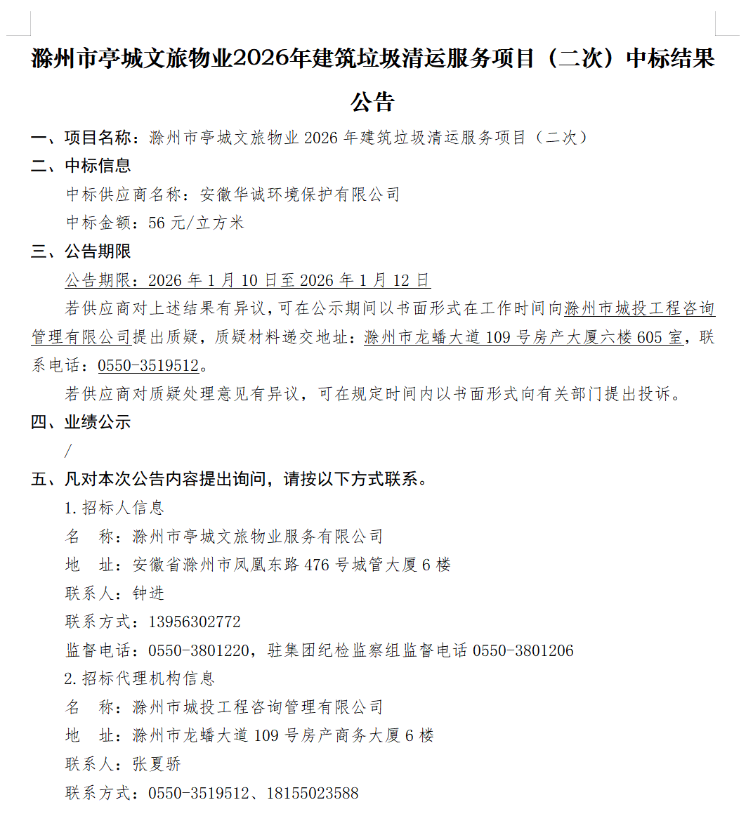 滁州市亭城文旅物业2026年建筑垃圾清运服务项目(二次)中标结果公告