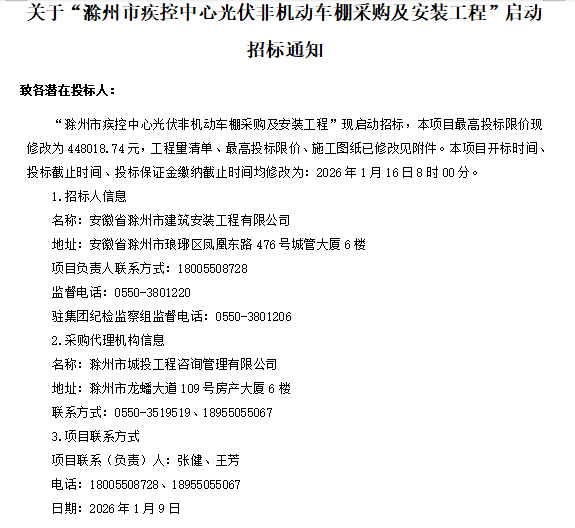 关于“滁州市疾控中心光伏非机动车棚采购及安装工程”启动招标通知