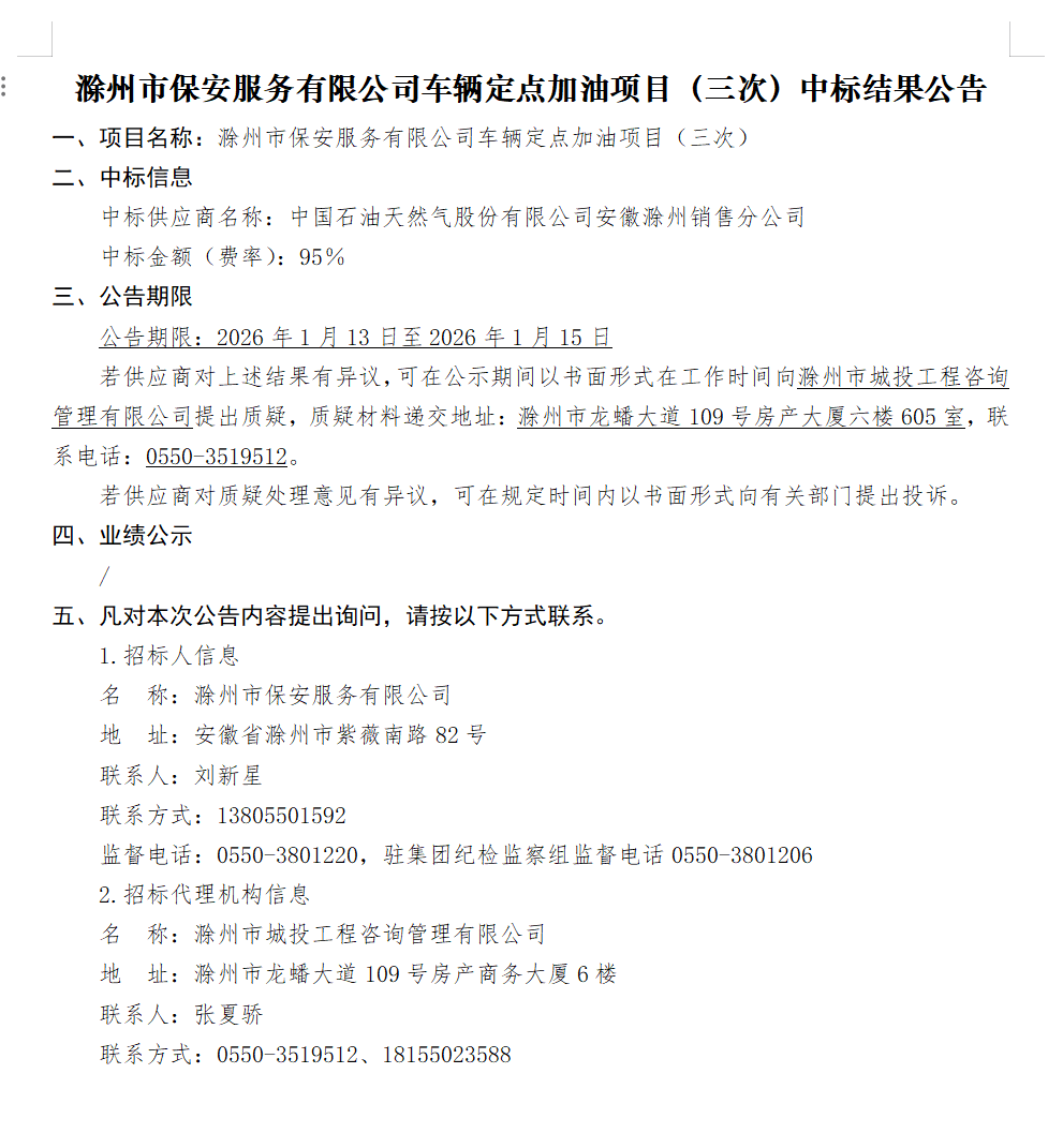滁州市保安服务有限公司车辆定点加油项目(三次)中标结果公告