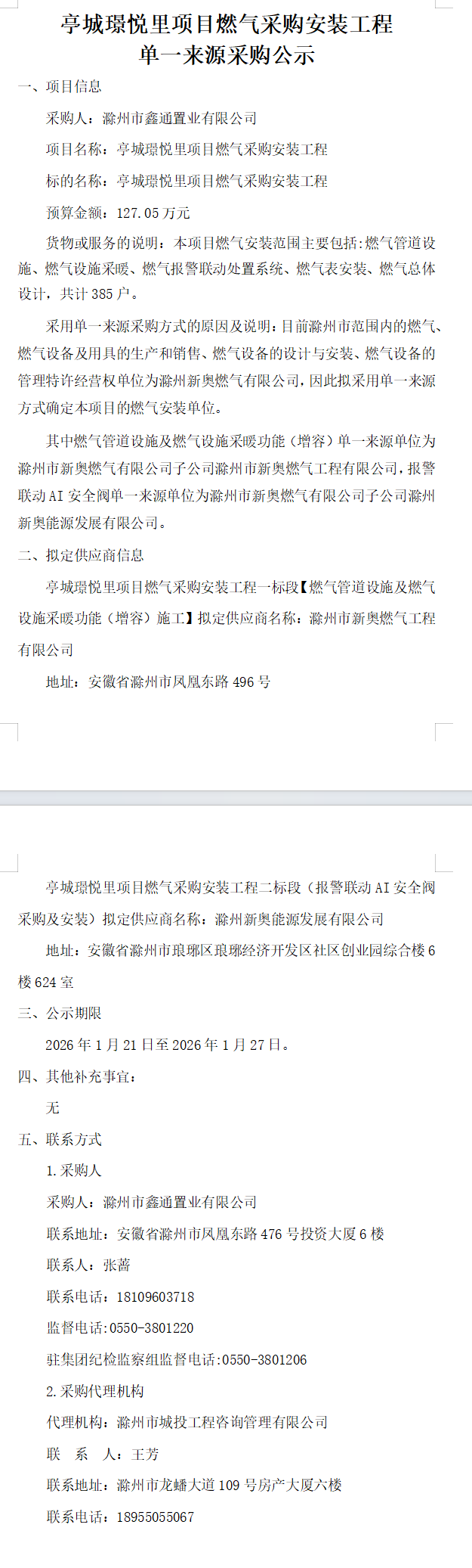 亭城璟悦里项目燃气采购安装工程 单一来源采购公示