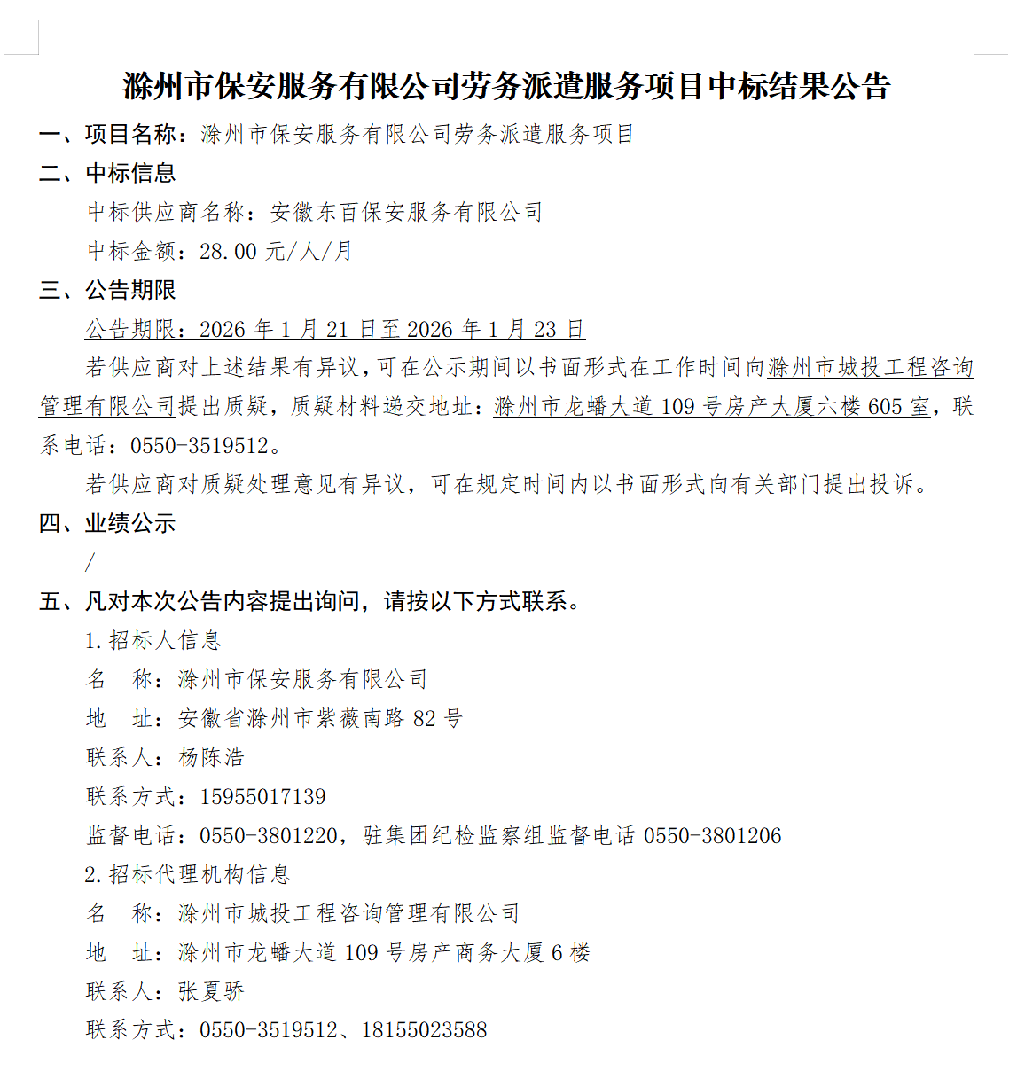 滁州市保安服务有限公司劳务派遣服务项目中标结果公告