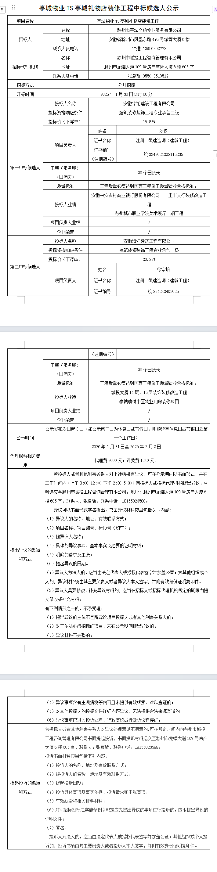 亭城物业TS亭城礼物店装修工程中标候选人公示