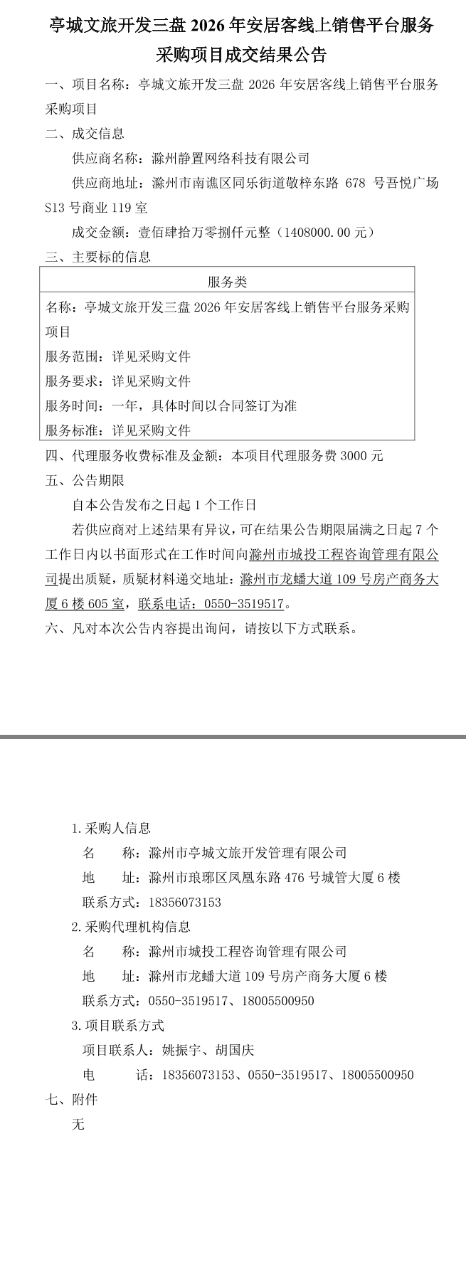 亭城文旅开发三盘2026年安居客线上销售平台服务采购项目成交结果公告