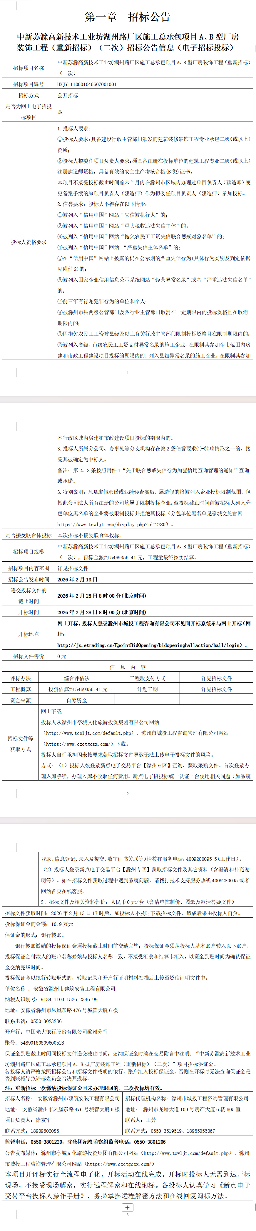 中新苏滁高新技术工业坊湖州路厂区施工总承包项目A、B型厂房装饰工程(重新招标)(二次)