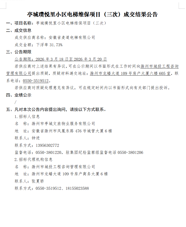 亭城璞悦里小区电梯维保项目(三次)成交结果公告