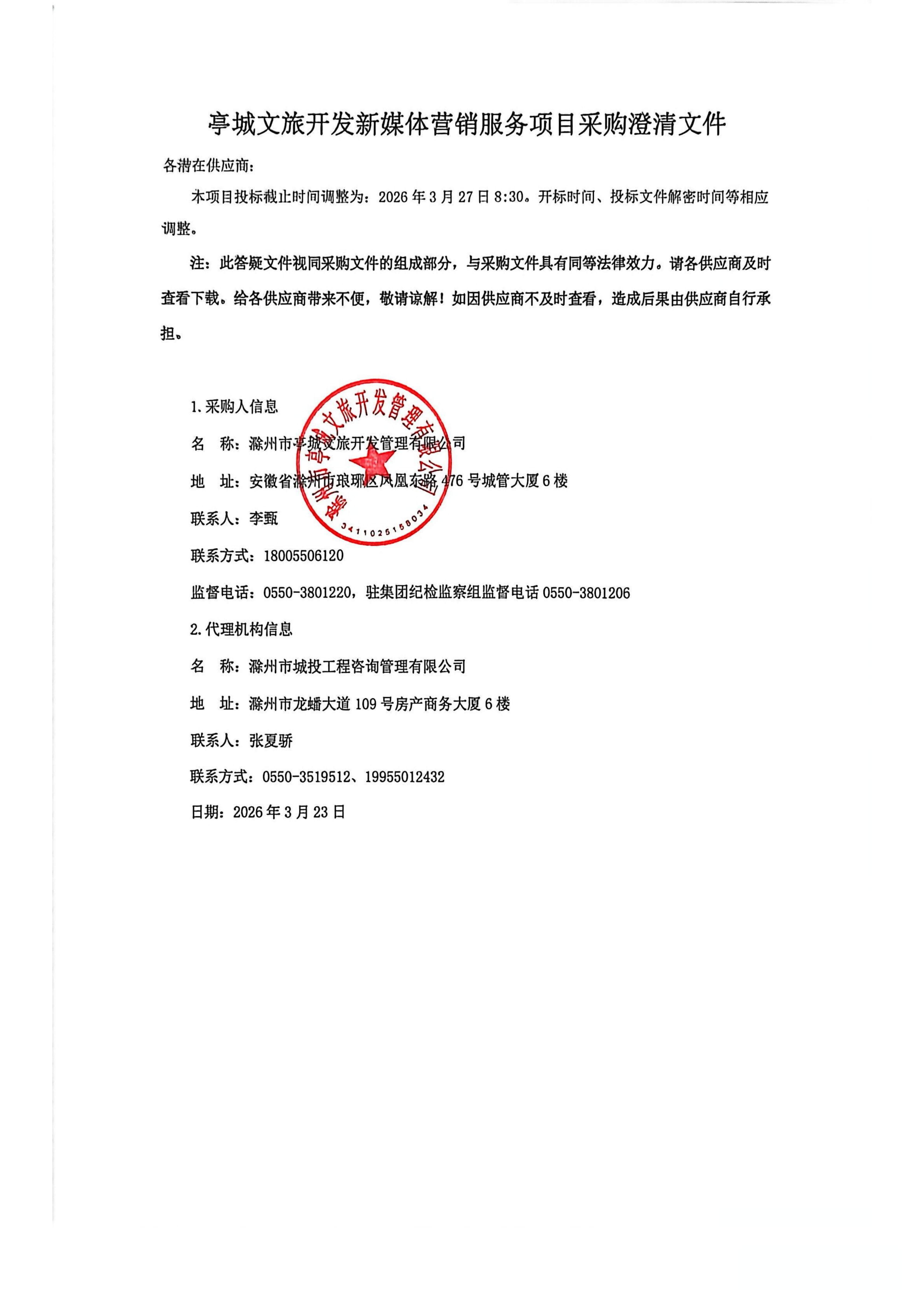 亭城文旅开发新媒体营销服务项目采购澄清文件
