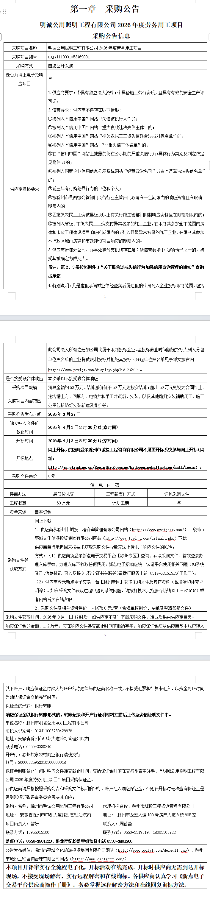 明诚公用照明工程有限公司2026年度劳务用工项目采购