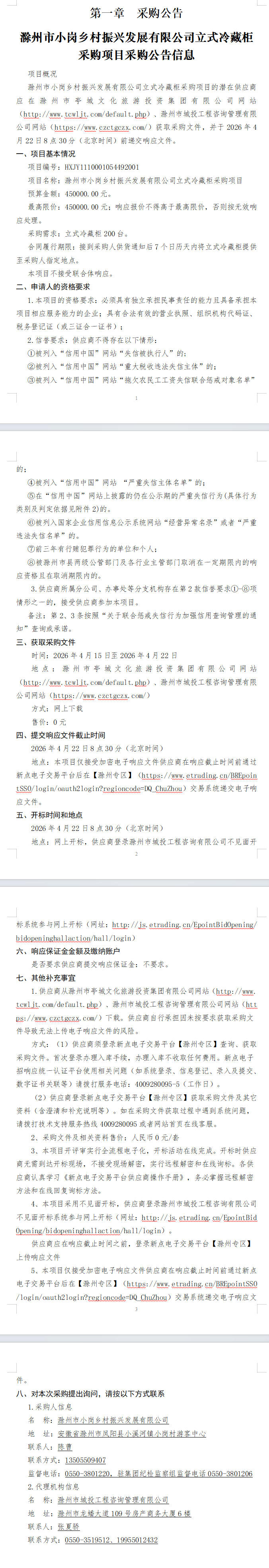 滁州市小岗乡村振兴发展有限公司立式冷藏柜采购项目